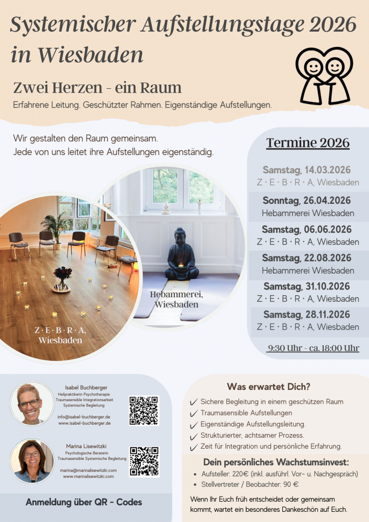 Alle Aufstellungstag im Duo mit Marina Lisewitzki. Wir gestalten den Raum gemeinsam und jede von uns leitet ihre Aufstellungen eigenständig.